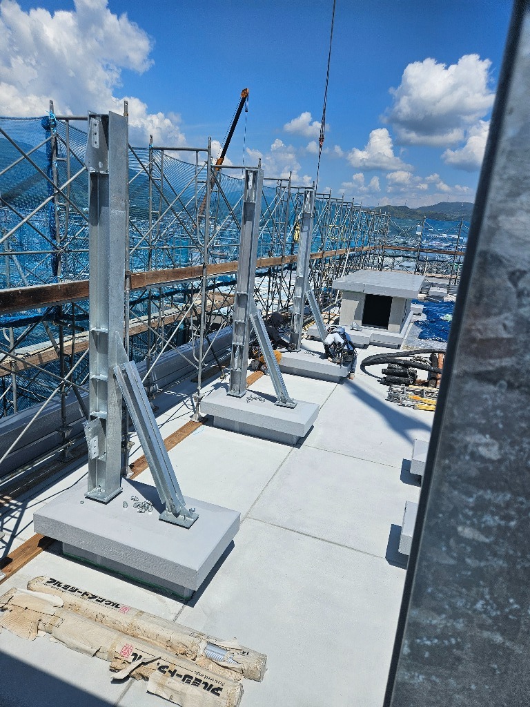 いよいよ大詰めの屋上に目隠しルーバーと言って完成したらオシャレな外観になり尚且つ外からは見づらくなる外壁の下地鉄骨です。